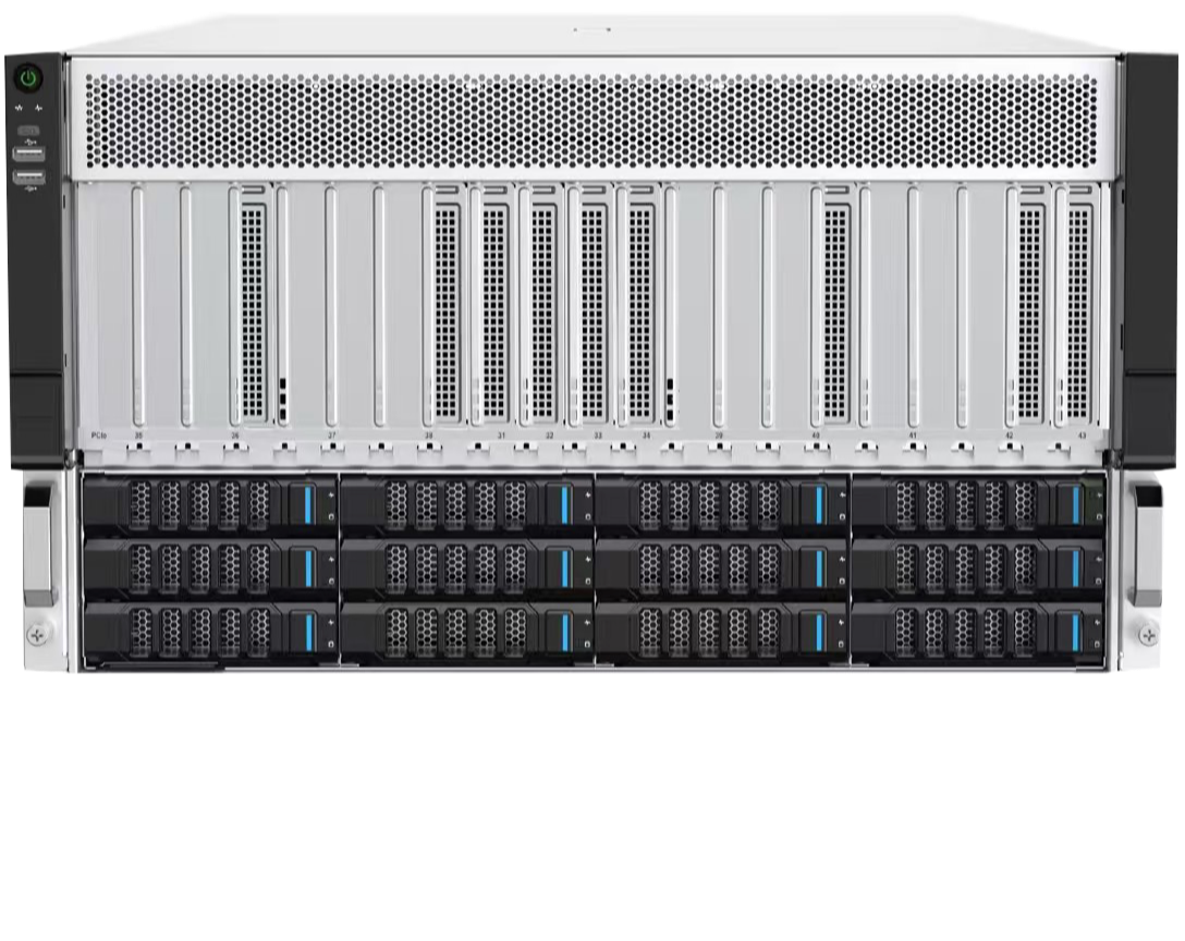JK-ASU24I,支持2颗英特尔®至强®第四代或第五代可扩展处理器,配合8通道5600MT/sDDR5内存技术,为用户提供高达50%的带宽提升。通过27个PCIe5.0插槽和多达12个硬盘插槽的支持,实现灵活的扩展能力。96%的电源能效,以及0℃~35℃的标准工作温度设计,为用户提供更高的能效回报。