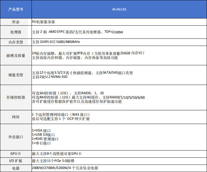 JK-AS22A 是面向 AI 全场景的高性能 GPU 服务器,基于 AMD EPYC Genoa/Turin 平台打造,单 CPU 最高可达 192 核。整机采用 4U 设计,支持 8 块双宽 AI 加速卡,AI 算力相较上一代翻倍提升,可轻松满足高强度算力需求。产品集卓越性能、稳定可靠与灵活扩展于一体,支持集群化部署与优化,具备高可靠、易维护、易管理等特点,广泛适配 AI 云计算、模型训练、在线推理、视频加速等多元核心业务场景。