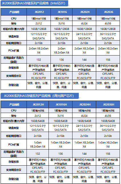 JK2000系列是基于Intel多核推出的高性能NAS存储系统。可提供卓越的投资回报率,降低用户的运营成本,最大限度地减少业务增长所带来的风险。其原生的NAS架构能够以更快的速度支持更加广泛。
