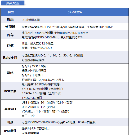 - 极客 JK-S422A 是一款基于 AMD EPYC 平台打造的 2U 双路高性能服务器,专为人工智能训练、科学计算、大规模虚拟化及高性能数据库等前沿算力密集型场景量身定制。产品支持双路 AMD EPYC 9004/9005 系列处理器,单颗最高可达 192 核,可输出顶级并行计算性能,轻松承载各类高负载算力需求。通过灵活提供 PCIe、M.2、OCP 等多用途扩展接口与方案,能够极大提升业务平台的计算能力与弹性扩展空间,为高端数据中心、科研创新及高端企业核心业务,提供坚实、灵活、高效的基础算力支撑。