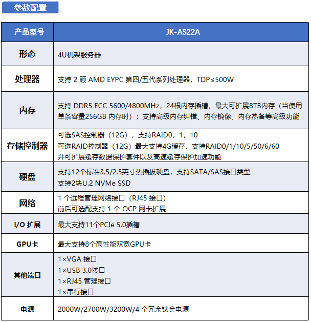 JK-AS22A 是面向 AI 全场景的高性能 GPU 服务器,基于 AMD EPYC Genoa/Turin 平台打造,单 CPU 最高可达 192 核。整机采用 4U 设计,支持 8 块双宽 AI 加速卡,AI 算力相较上一代翻倍提升,可轻松满足高强度算力需求。产品集卓越性能、稳定可靠与灵活扩展于一体,支持集群化部署与优化,具备高可靠、易维护、易管理等特点,广泛适配 AI 云计算、模型训练、在线推理、视频加速等多元核心业务场景。