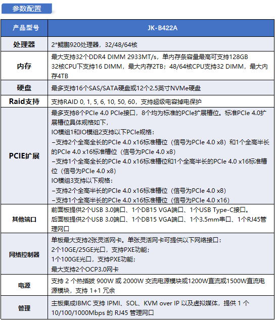 JK-B422A 鲲鹏 920 2U 双路服务器系列,依托国产化平台打造,提供企业级多核高并发计算性能与灵活扩展能力,可实现同构部署、零性能损耗,完美适配移动应用云化需求。产品适用于对信息安全要求严苛的云计算、大数据、分布式存储、ARM 原生应用、高性能计算及数据库等核心场景,兼顾多样性计算与绿色计算双重需求,高效匹配海量数据处理型业务,为国产化 IT 基础设施提供稳定、安全、高效的算力支撑。